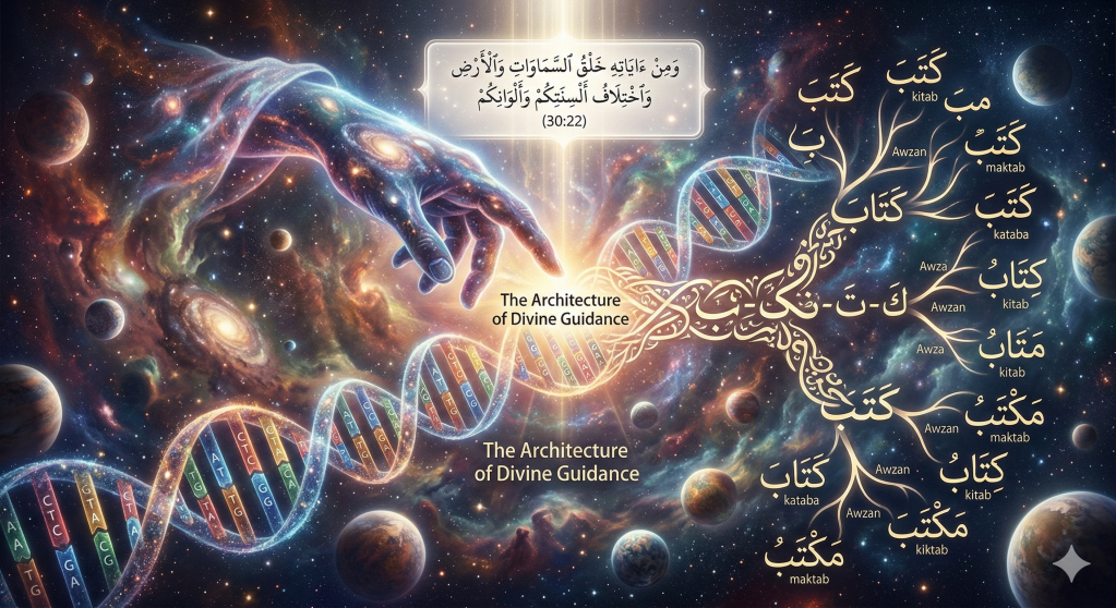 This research report evaluates the structural and ontological parallels between the biological mechanisms of life and the linguistic architecture of the Arabic language as a primary exhibit for the paradigm of “Guided Evolution.” By synthesizing the extensive writings of Zia H. Shah MD with contemporary molecular biology, generative linguistics, and classical philology, the analysis demonstrates that the universe is governed by two interconnected and functionally analogous codes: a four-lettered chemical code (DNA) used to construct the biological hardware of approximately 9 million extant species, and a three-lettered trilateral root system (Arabic) that serves as a sophisticated linguistic software for divine guidance. The report explores the concept of “Guided Evolution” as proposed by Shah, arguing that the transition from blind, random processes to purposive design is evident in the universality of the genetic code and the mathematical precision of Semitic morphology. Through a detailed examination of Quranic verses, specifically Surah Ar-Rum 30:22, the study illustrates how the diversity of tongues and colors serves as a divine sign for those with knowledge. Ultimately, the report posits that the Arabic language is not a product of random linguistic drift but a premeditated tool for guidance, optimized for human cognition and resistant to the entropy of time. Incorporating the perspectives of prominent linguists like Noam Chomsky, Steven Pinker, and Guy Deutscher, the analysis highlights the “mystery” of language origins as a point of convergence where scientific inquiry meets theological reflection.